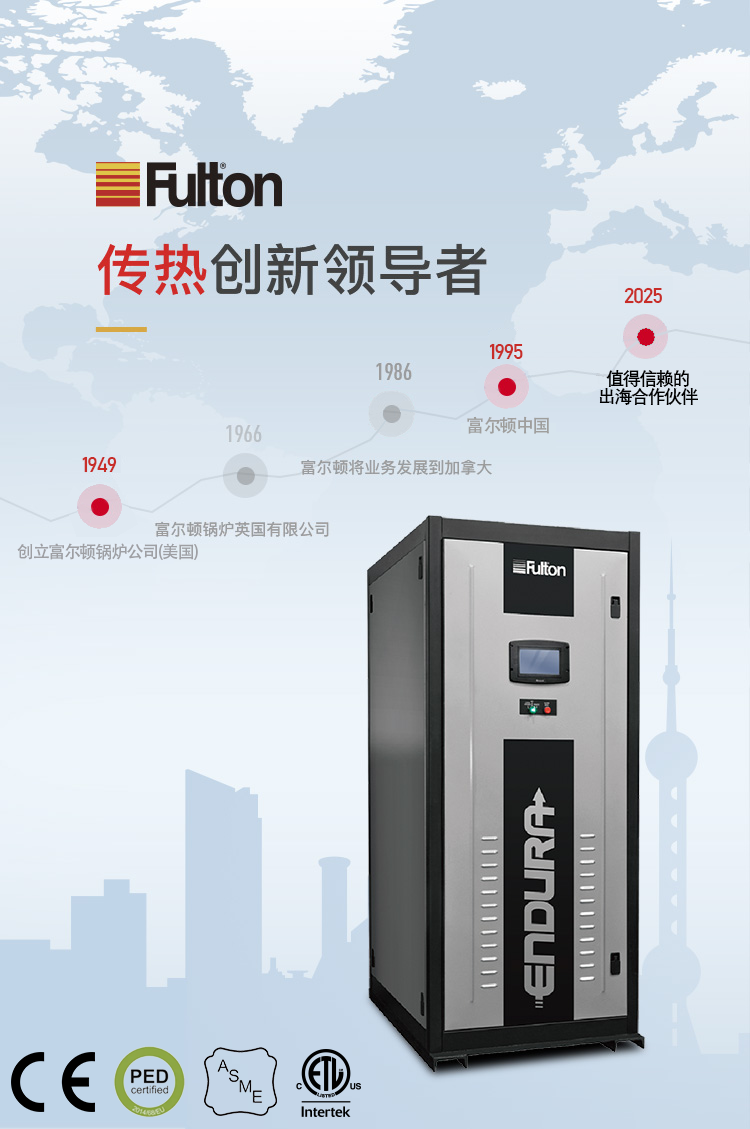 富爾頓是國(guó)際著名的跨國(guó)高質(zhì)量傳熱產(chǎn)品制造商,具有七十多年的專(zhuān)業(yè)設(shè)計(jì)、制造、銷(xiāo)售鍋爐的經(jīng)驗(yàn),是立式無(wú)管鍋爐和脈沖燃燒鍋爐的發(fā)明者,幾十年來(lái)一直領(lǐng)導(dǎo)世界鍋爐新潮流。